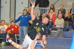 Kreisläufer Manuel Honerkamp erzielt in dieser Szene eins seiner vier Tore für den ASV. Gästetrainer Walter Schubert (im Hintergrund) geht richtig mit. Foto: rau