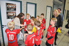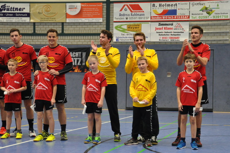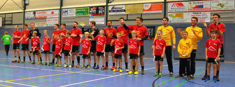 Viel Spaß hatten am vergangenen Sonntag unsere jungen Spieler aus der E1-Jugend. Zuerst hatten Sie die Möglichkeit mit den Verbandsliga-Herren beim Spiel gegen Plettenberg/Werdohl (34:19) einzulaufen. In der Halbzeitpause erhielt dann das Team von Trainer Timo Sommerfeld (selbst in Kurzurlaub an dem Tag) offiziell die neuen Trikots.