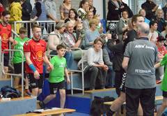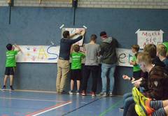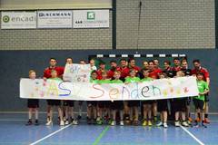 Nachdem einige der Jungs schon gegen fünf Uhr mit einer Trainingseinheit Fußball in den Tag starteten, kräftigten sich alle dann am (normalen) Morgen bei einem reichhaltigen Frühstück. Gemeinsames Spielen und Basteln am Morgen wurde gegen Mittag von einer Fahrradtour zu einer Lüdinghausener Eisdiele abgelöst. Bei wechselndem Wetter trat die Mannschaft dann gestärkt die Fahrt zur neuen Halle nach Senden an. Hier unterstützen die Spieler das letzte Heimspiel unserer Ersten Herrenmannschaft als Einlaufkids und mit lautstarkem Anfeuern. Die am Morgen gebastelten Überraschungsbanner, welche die Mannschaft motivieren sollten, taten ihr Übriges. Durch die tolle Stimmung in der gefüllten neuen Halle zeigten unsere Herren den Gegnern aus Siegen ihre Grenzen auf. Ein Abschlussfoto mit der Ersten beendete dann am Samstagnachmittag einen gelungenen Saisonabschluss. [Mag.]