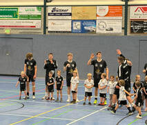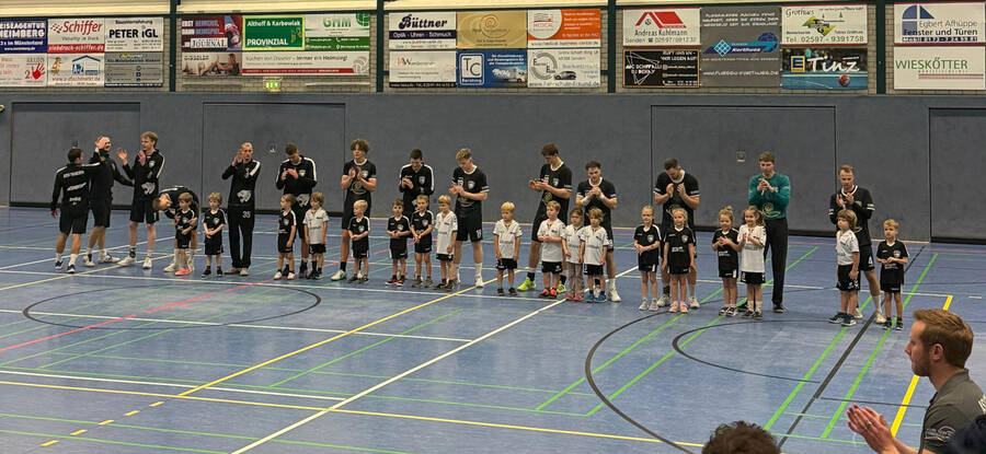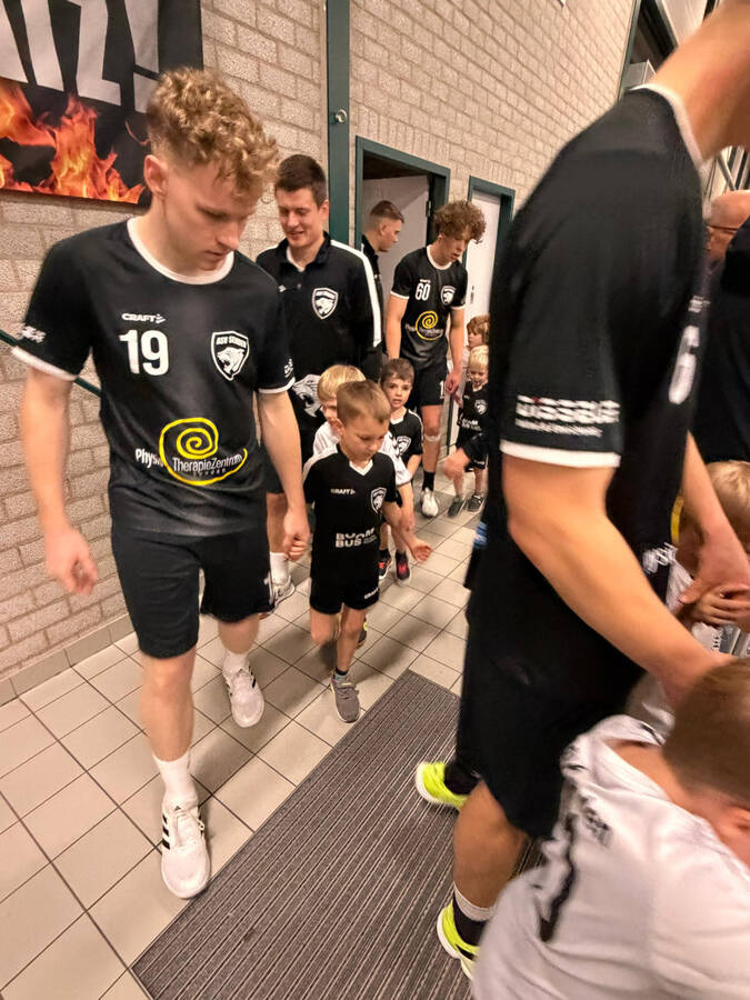 Am Sonntagnachmittag sind beim Spiel der Ersten Herren unsere MiniMinis mit eingelaufen, was sicherlich einen schönen Abschluss ihres Handballjahres darstellte. Stolz liefen die Mädchen und Jungen dabei mit den neuen Trikots der Minis auf, im Sommer ermöglicht durch die Teamsponsoren "Boom Bus- DIE mobile Eventlösung" und der "Kanzlei Stenpaß - Steuerberatung".