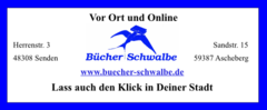 Beide angelesenen Bücher können für die Kinder selbstverständlich in der Bücherei Schwalbe, Herrenstraße 3, erworben werden.