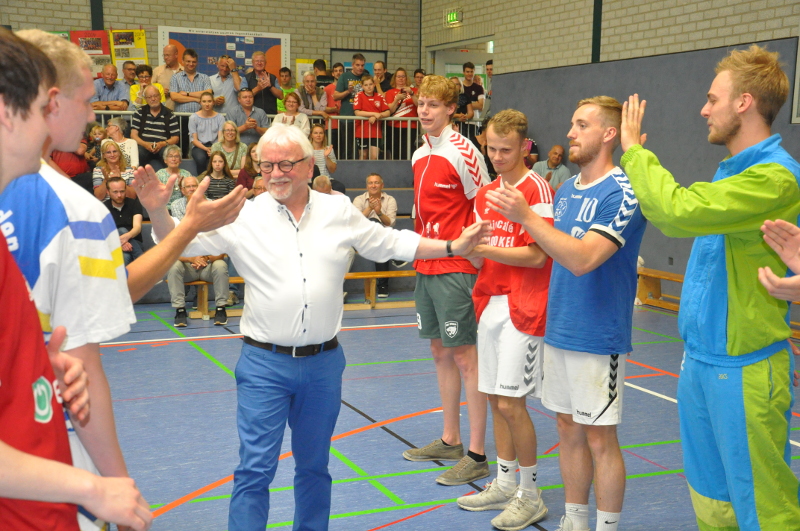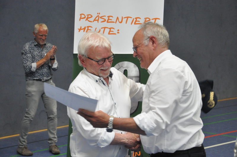 Einen überraschenden Höhepunkt gab es dann für Jochen Jungblut. Von keinem geringeren als dem Vorsitzenden des Handballverbandes Westfalen, Wilhelm Barnhusen, wurde er für seine 30-jährige Tätigkeit als Abteilungsleiter mit der Goldenen Ehrennadel, der höchsten Auszeichnung des Verbandes, geehrt. Vorher musste er ein kleines Spalier aus Spielern der Ersten mit Trikots aus den letzten Jahrzehnten passieren.