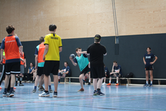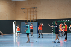 Nach einer Verpflegungspause mit Brötchen und Kuchen ging es endlich in die nächstgelegene Sporthalle. Fleißiges Aufwärmen, Dribbeln, Passen und Co wurden am Ende mit einer tollen Partie Handball belohnt, bei der wir mit den Teilnehmern aus Duisburg und Ahlen neue Mannschaften bildeten.